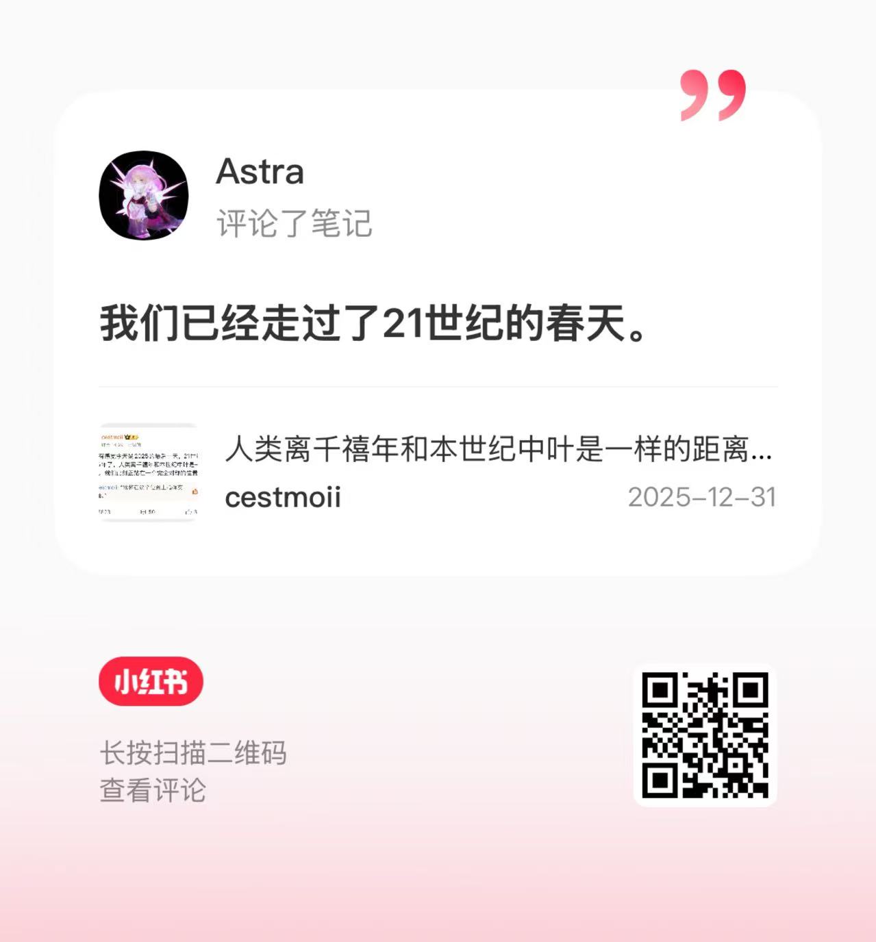 2025 年又到了最后一天,在小红书刷着刷着,看到一条评论说“我们已经走过了 21 世纪的春天”,在这白雾霭霭的冬日窝在家里突然又有很废话可讲,赶紧打开电脑写下来。
